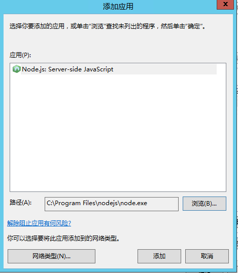 控制面板=》系統(tǒng)和安全=》Windows防火墻=》 允許應(yīng)用或功能通過Windows防火墻=》 允許其他應(yīng)用=》瀏覽選擇 Nodejs應(yīng)用=>添加