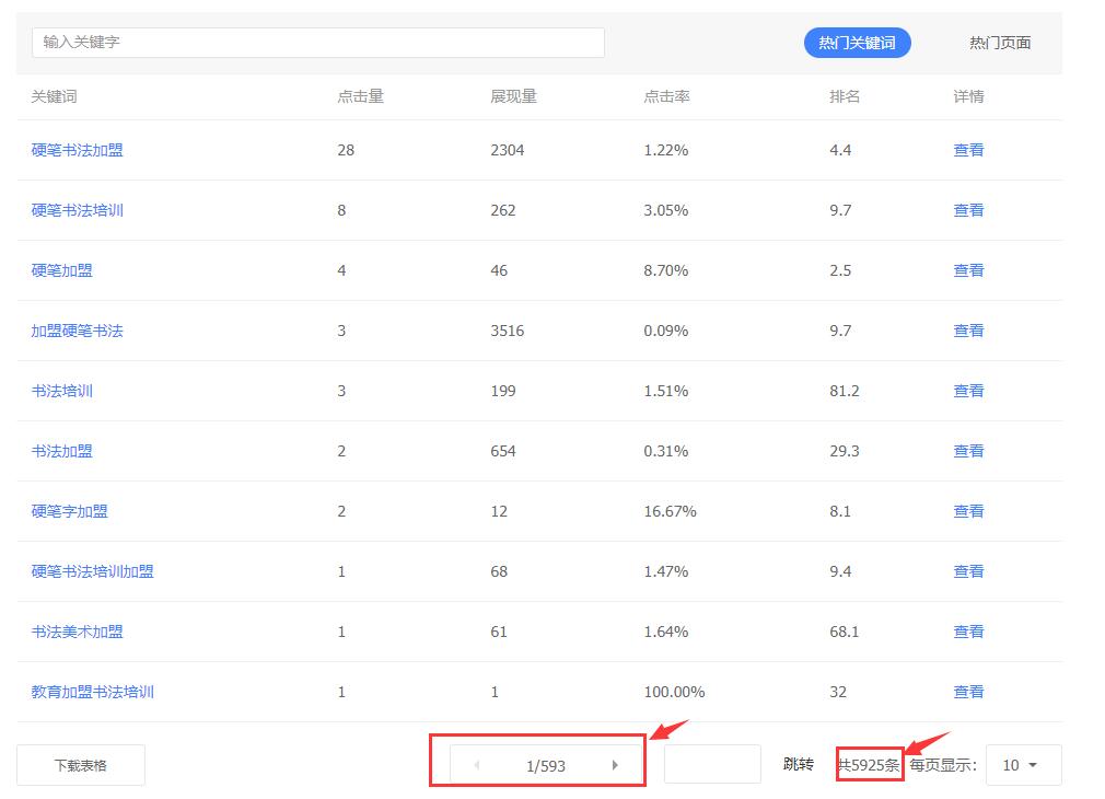 網(wǎng)站相關(guān)關(guān)鍵詞展示訪問(wèn)情況(數(shù)據(jù)來(lái)自百度官方站長(zhǎng)工具數(shù)據(jù)統(tǒng)計(jì));我們看到網(wǎng)站相關(guān)展示關(guān)鍵詞為5925條,其中核心關(guān)鍵詞 硬筆書(shū)法加盟排名穩(wěn)定在百度搜索自然排名前五(全國(guó)范圍內(nèi)),數(shù)據(jù)追蹤發(fā)現(xiàn),這期間很長(zhǎng)一段時(shí)間一直第一名。