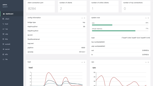 支持tcp、udp流量轉發(fā),支持內網(wǎng)http代理、內網(wǎng)socks5代理,同時支持snappy壓縮、站點保護、加密傳輸、多路復用、header修改等。支持web圖形化管理,集成多用戶模式。